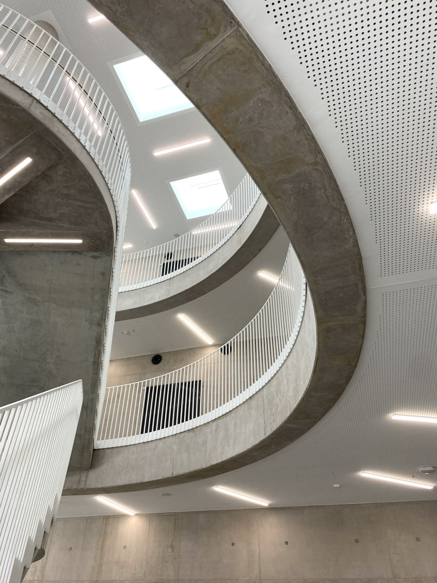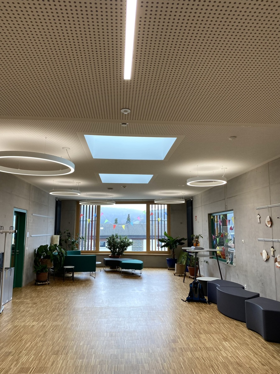 Beim Neubau des Schulcampus in Blumberg wurde die Exonis Montagetechnik GmbH mit der Umsetzung anspruchsvoller Innenausbauarbeiten im Bereich Deckenbau als Lohnleistung beauftragt. Bestandteil unserer Leistung war die Montage abgehängter Akustikdecken, ergänzt durch ein rundes Gipsfries, das gestalterisch und funktional in das Deckenkonzept integriert wurde. Zusätzlich erfolgte das präzise Auskleiden der Lichtkuppeln sowie die Montage einer Außendecke mit umlaufender Schattenfuge. Alle Arbeiten wurden unter höchsten Qualitätsstandards, mit sauberer Detailausbildung und in enger Abstimmung mit den weiteren Ausbaugewerken realisiert.